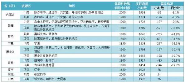 內蒙古I類(lèi)資源區、新疆、甘肅、青海I類(lèi)資源區、寧夏、陜西、吉林、遼寧和河北等地區未達到要求,其中,新疆和甘肅實(shí)際利用小時(shí)數與最低保障收購年利用小時(shí)數偏差超過(guò)350小時(shí)。