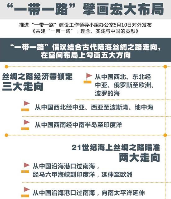 根據這五大方向,按照共建“一帶一路”的合作重點(diǎn)和空間布局,“六廊六路多國多港”的合作框架躍然紙上,為各國參與“一帶一路”合作提供了清晰指向。