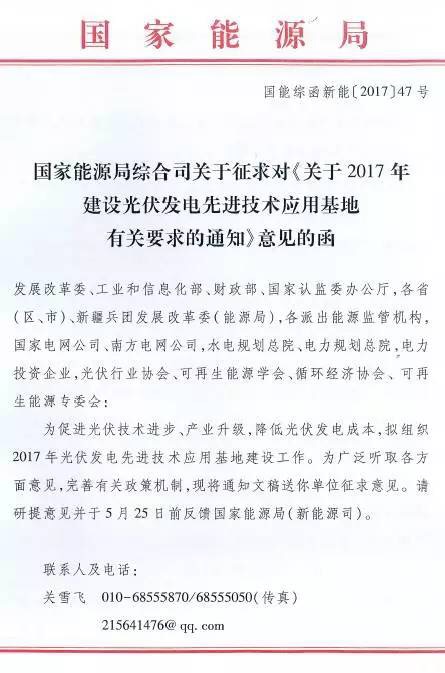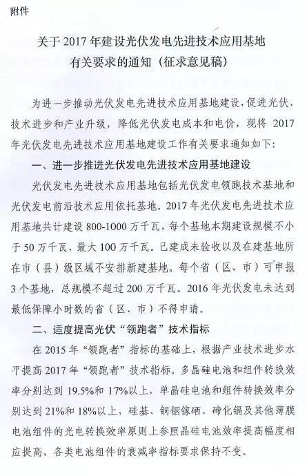 近日,華夏能源網(wǎng)(微信號sinoergy_com)獲悉,國家能源局綜合司發(fā)出了名為《關(guān)于2017年建設光伏發(fā)電先進(jìn)技術(shù)應用基地有關(guān)要求的通知》的征求意見(jiàn)稿,對光伏發(fā)電先進(jìn)技術(shù)應用基地建設的規劃、優(yōu)選、評分規則等做意見(jiàn)征集。