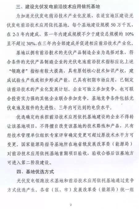 相比此前業(yè)界盛傳的“領(lǐng)跑者升級版”計劃,通知提出的“光伏發(fā)電前沿技術(shù)應用依托基地”明顯縮水,每個(gè)基地建設規模確定為500M瓦(此前傳說(shuō)每個(gè)基地至少1GW),基地在2-3年內建成,第一年內建成規模不少于建設總規模的10%且不超過(guò)30%,在三年內全部建成并促進(jìn)相應前沿技術(shù)產(chǎn)業(yè)化。