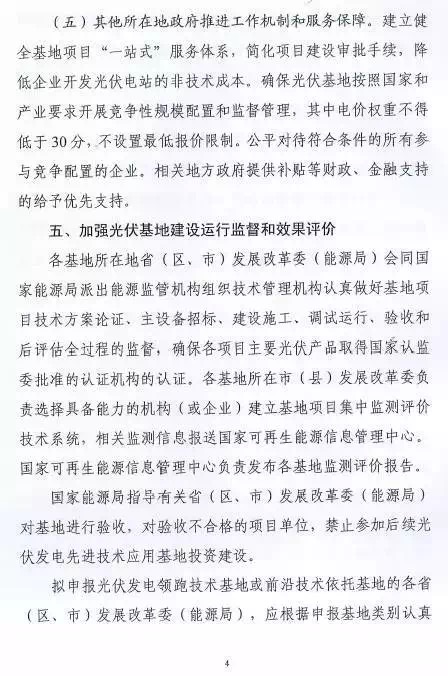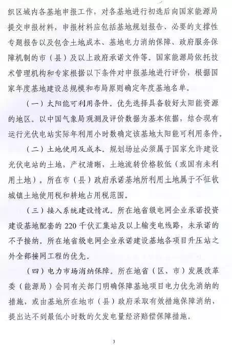 每個(gè)省(區、縣)可申報3個(gè)基地,總規模不超過(guò)2G瓦。2016年光伏發(fā)電未達到最低保障小時(shí)數的省(區、縣)不得申請。已建成未驗收以及在建基地所在市(縣)級區域不安排新建基地。
