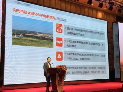 胡兵開(kāi)門(mén)見(jiàn)山,以分享者的姿態(tài),將陽(yáng)光電源在參與大同光伏“領(lǐng)跑者”基地建設近兩年來(lái)的努力和思考,向與會(huì )來(lái)賓和盤(pán)托出。胡兵介紹稱(chēng),陽(yáng)光電源憑借二十年新能源發(fā)電領(lǐng)域的技術(shù)積累和創(chuàng )新能力,將直流1500V光伏技術(shù)、跟蹤系統技術(shù)、生態(tài)修復技術(shù)等前沿創(chuàng )新成果,充分展示和運用在“領(lǐng)跑者”基地項目建設中。