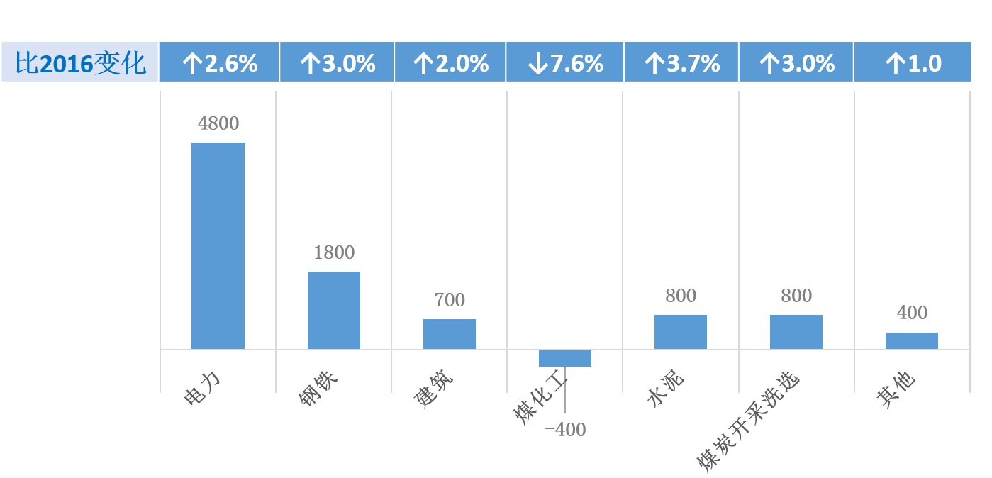 部門(mén)煤控目標:2017年煤耗總量下降目標4.2%中,部門(mén)的貢獻率在55%以上,即減少0.89億噸煤,其中電力、鋼鐵、水泥、煤化工在4.2%的總目標中貢獻約2%,見(jiàn)圖3。在部門(mén)煤控的各項工作中,制定高目標。2017年6月堅決徹底地淘汰地條鋼生產(chǎn)企業(yè)。僵尸企業(yè)在2017年6月底全部清除完畢,技術(shù)落后、高污染和安全生產(chǎn)風(fēng)險高的企業(yè)要停產(chǎn)整頓和關(guān)閉,小、散、亂、污企業(yè)要清理。