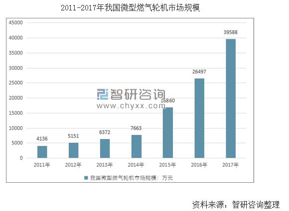 2017年6月,發(fā)改委和能源局聯(lián)合發(fā)布的《依托能源工程推進(jìn)燃氣輪機創(chuàng )新發(fā)展的若干意見(jiàn)》提出,到2020年,各類(lèi)中小型燃機自主設計制造體系進(jìn)一步完善,各類(lèi)中小型燃氣輪機裝備初步實(shí)現系列化,滿(mǎn)足各類(lèi)能源項目需求。近幾年,我國微型燃氣輪機市場(chǎng)發(fā)展迅猛,2011年我國微型燃氣輪機市場(chǎng)規模僅4136萬(wàn)元,到2017年已達到39588萬(wàn)元,年均復合增長(cháng)率高達45.71%。按照這個(gè)速度發(fā)展,預計到2020年我國微型燃氣輪機市場(chǎng)規模將超過(guò)10億。