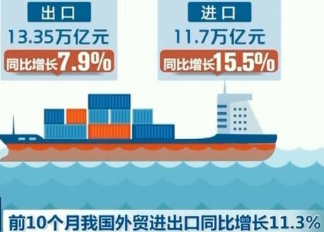 前10月我國外貿進(jìn)出口增長(cháng)11.3%據海關(guān)統計,今年前10個(gè)月,我國貨物貿易進(jìn)出口總值25.05萬(wàn)億元,比去年同期增長(cháng)11.3%。其中,出口13.35萬(wàn)億元,增長(cháng)7.9%;進(jìn)口11.7萬(wàn)億元,增長(cháng)15.5%;貿易順差1.65萬(wàn)億元,收窄26.1%。 [詳細]