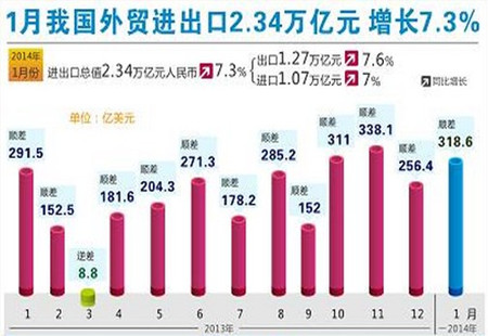 商務(wù)部:1月外貿合乎邏輯 虛假出口猜測缺乏根據根據中國海關(guān)總署此前公布的數據,2014年1月中國進(jìn)出口總值為3824億美元,增長(cháng)(同比,下同)10.3%。其中,出口2071.3億美元,增長(cháng)10.6%;進(jìn)口1752.7億美元,增長(cháng)10%;貿易順差318.6億美元,擴大... [詳細]