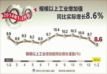 1-2月投資、工業(yè)和消費增速均低預期 經(jīng)濟下行壓力大2014年1-2月份,規模以上工業(yè)增加值同比實(shí)際增長(cháng)8.6%(以下增加值增速均為扣除價(jià)格因素的實(shí)際增長(cháng)率)。從環(huán)比看,2月份比上月增長(cháng)0.61%。分三大門(mén)類(lèi)看,1-2月份,采礦業(yè)增加值同比增長(cháng)3.5%,制造業(yè)增長(cháng)9.8%... [詳細]