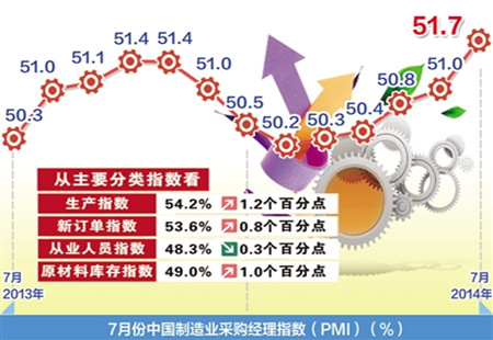 7月中國制造業(yè)PMI顯示:經(jīng)濟增速呈回升態(tài)勢2014年7月份中國制造PMI為51.7%,比上月上升0.7個(gè)百分點(diǎn)。該指數自今年3月份以來(lái)持續上升,升幅擴大,為今年以來(lái)最大升幅。主要分項指數保持同步回升,普遍達到去年同期水平以上。從PMI來(lái)看,當前經(jīng)濟活動(dòng)進(jìn)一步活躍... [詳細]