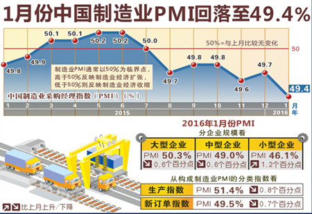 1月份制造業(yè)PMI季節性回落 經(jīng)濟趨穩基礎尚需鞏固中國物流與采購聯(lián)合會(huì )、國家統計局服務(wù)業(yè)調查中心1日發(fā)布的數據顯示,2016年1月份中國制造業(yè)采購經(jīng)理指數(PMI)為49.4%,比上月下降0.3個(gè)百分點(diǎn)。當前經(jīng)濟趨穩基礎還需進(jìn)一步鞏固,但穩中向好態(tài)勢未有改變。 [詳細]