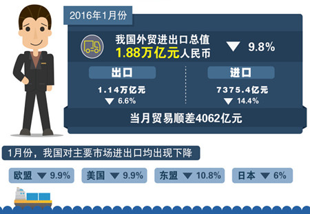 1月我國進(jìn)出口總值降9.8% 出口下降6.6%海關(guān)總署今天公布2016年1月我國外貿進(jìn)出口情況。數據顯示,今年1月我國進(jìn)出口總值1.88萬(wàn)億元,同比下降近10%,貿易順差4062億元,擴大12.2%。 [詳細]
